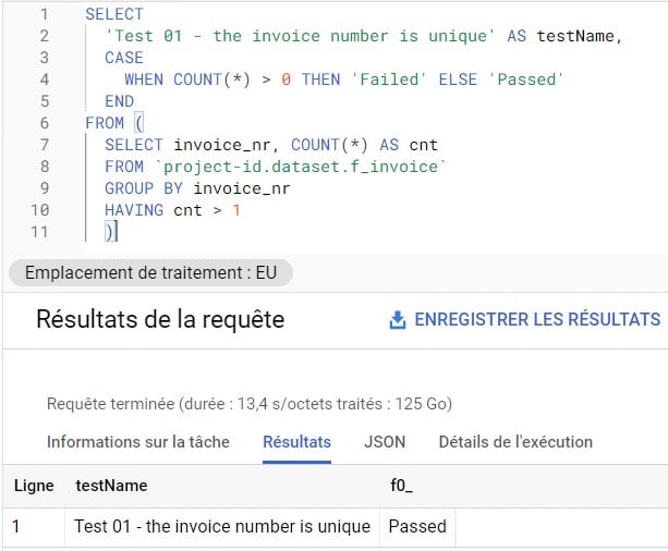 Nous avons défini nos différents cas (nombre de statuts, montant total = somme des lignes, etc.). Réunissons maintenant nos tests avec UNION ALL pour ne produire qu’un résultat.