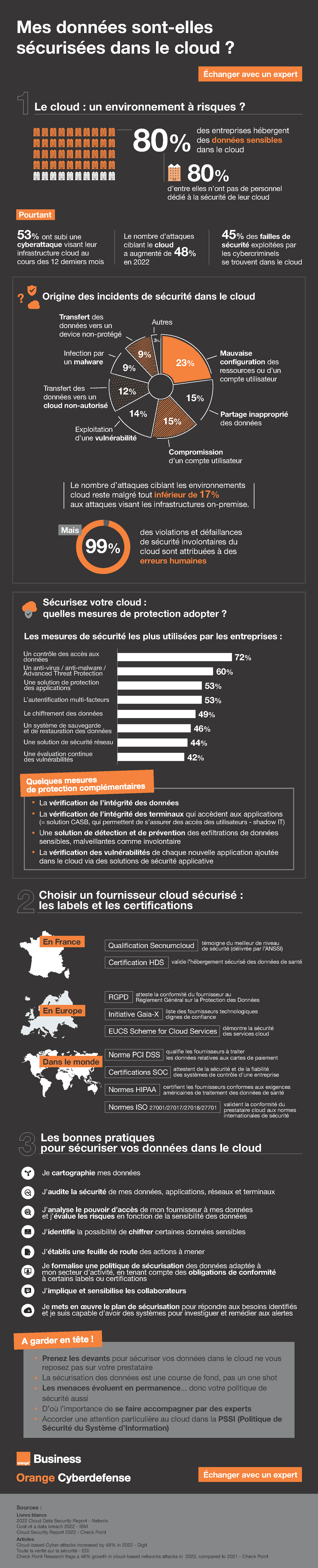 Comment vous assurer que vos données sont bien sécurisées dans le cloud ? Réponses dans cette infographie : origines des incidents de sécurité dans le cloud, mesures de protection à adopter, labels et certifications des fournisseurs cloud sécurisé…