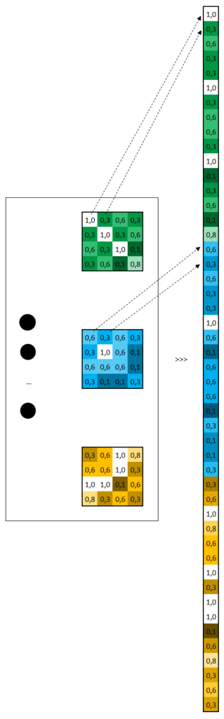 Cela consiste tout simplement à prendre la totalité des valeurs de nos matrices précédemment calculées, et à les empiler, en vue de les exploiter dans la couche d’entrée d’un réseau de neurones.