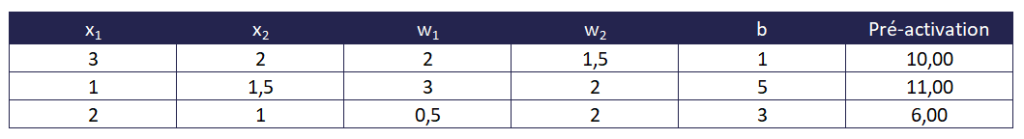 Dans la situation décrite dans l’image, notre pré-activation est égale à :